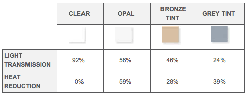 Colours: Clear, Bronze Tint, Grey Tint, Opal